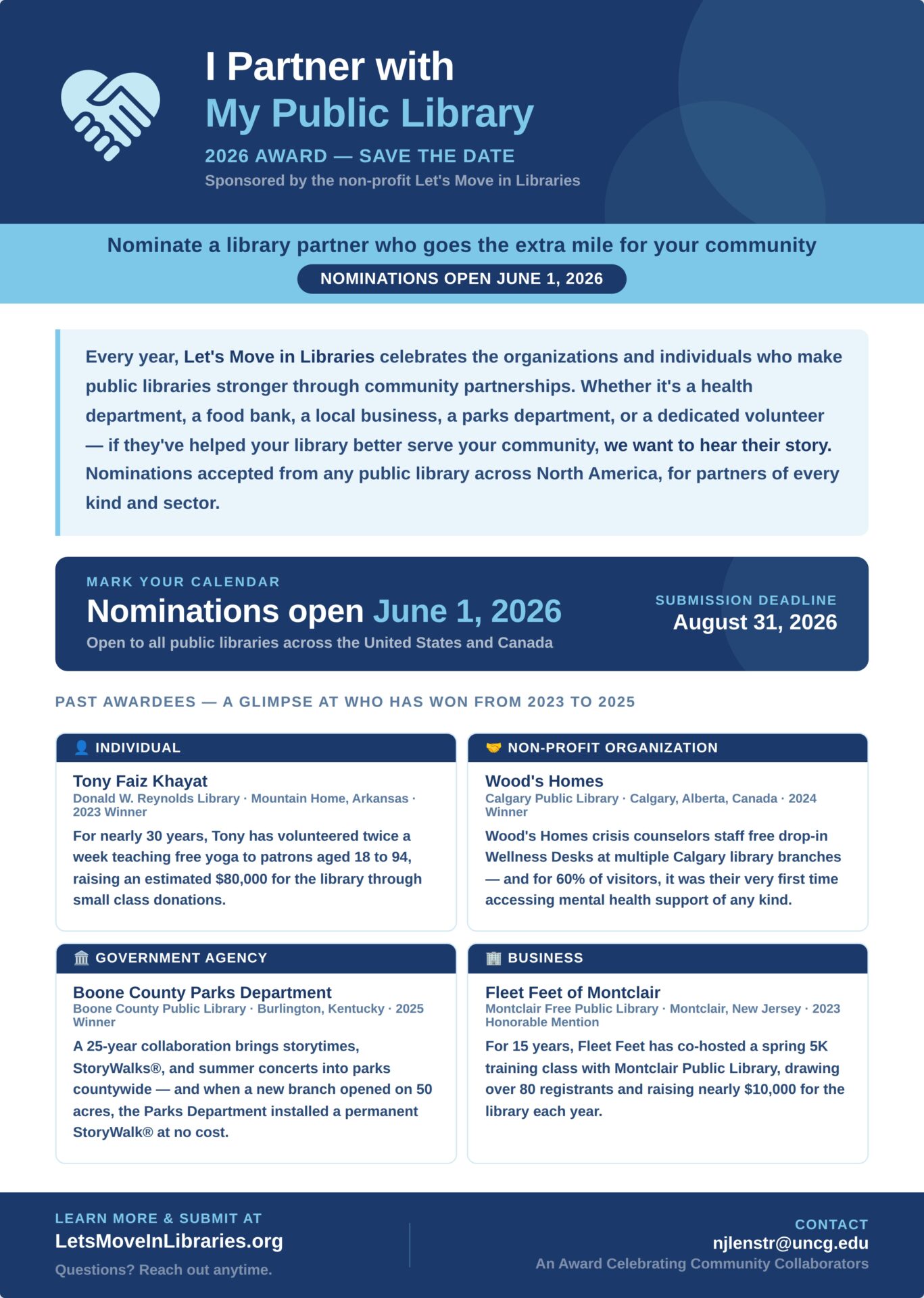 On Friday, November 14, 2025 the international non-profit Let’s Move in Libraries honors these partners at the 2025 I Partner with My Public Library Awards in an Awards Ceremony. All are welcome to join us for this celebration.